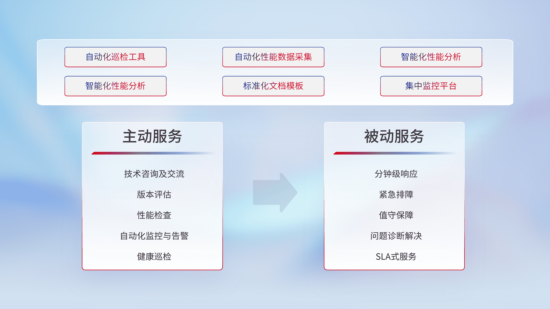 智能化工具和标准化文档,,保障服务质量,,,提供主动服务(包含技术咨询、、、、版本评估、、性能检查、、自动化监控与告警、、健康巡检)和被动服务包含(分钟级响应、、、、紧急排障、、值守保障、、、问题诊断解决、、、、SLA服务)。。。。